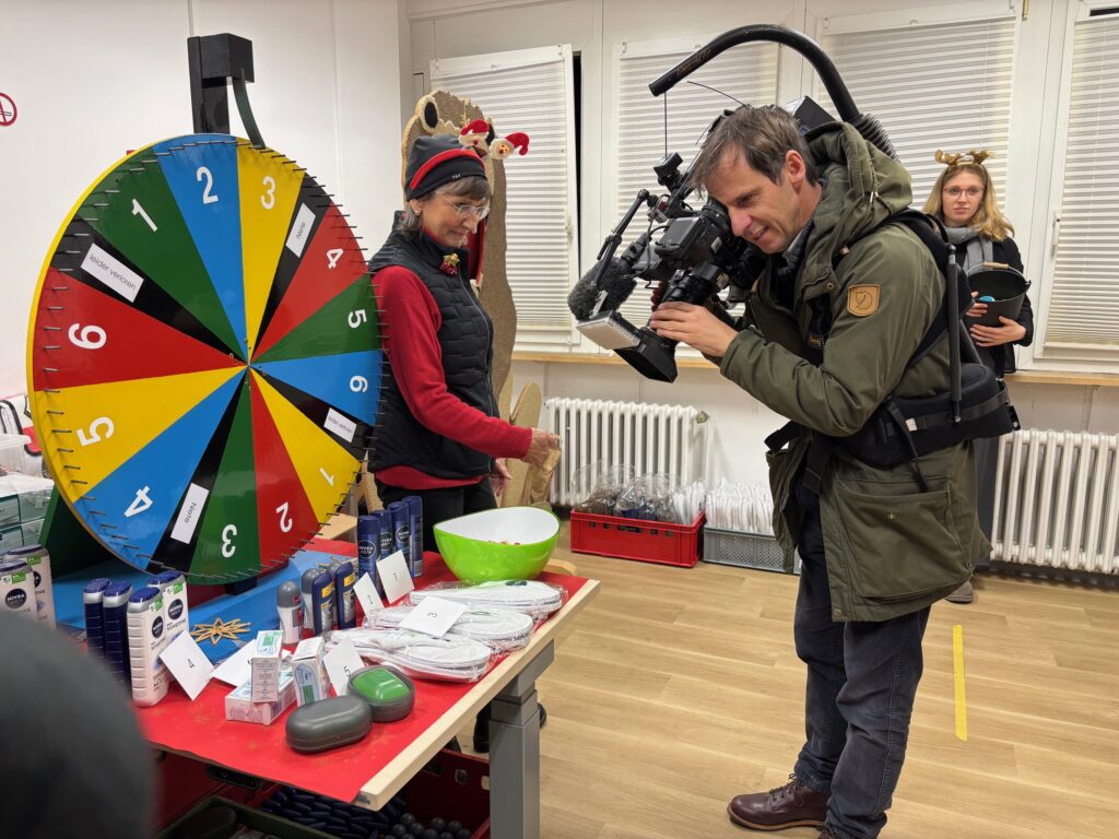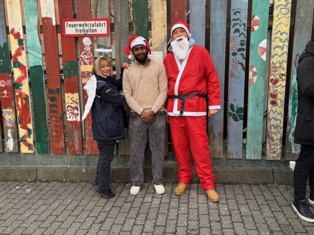 Lange haben der Förderverein PIK AS e.V. und das Pik As Team von Fördern & Wohnen darauf hingearbeitet. Jetzt schwebt ein Engel mit weißen Flügeln durch die Räumlichkeiten, einen zünftigen Weihnachtsmann gibt es auch, ein Glücksrad, eine Ballwurfbude und Kleiderständer mit Mänteln, Handschuhen, Mützen und Schals zum Mitnehmen für kalte Tage. Dank an den Lions Club Hamburg 13, die gleich mit vier Mitgliedern angerückt sind, und den Chef der Positiven Pflege Tunjašević, der Geschenkpäckchen mit Duschgel, Reisedeo und kleinen Süßigkeiten verteilt.
