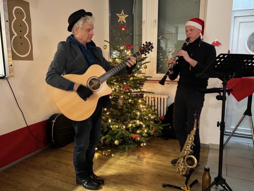 Dazu Musik vom Feinsten von Thomas Krakowczyk an der Gitarre und Jens Gutzmann an Klarinette und Saxophon, ein bisschen Jingle Bells, ein bisschen Blues und Jazz. Obwohl auch das NDR Hamburg Journal mit einem Team dabei ist, ist es nicht die ganz große Bühne für die Musiker, denn im Mittelpunkt steht ja das Publikum an den Tischen vor dem Weihnachtsbaum.